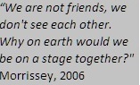 But more to the point, why would we even want a reunion? We have Morrissey. We even have Johnny Marr if that’s your bag. Why do people feel the need to see them together on stage? So they can pretend they’ve gone back in time to 1985?