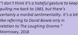 And it’s not just the press that constantly refer back to the first few years of Morrissey’s career. There seem to be a number of fans stuck in the eighties too. Comments on social media continue to include wailings at the Smiths’ demise, calls for a reunion, and calls for more Smiths songs at Morrissey shows. Personally, I just don’t understand this mentality, and I’ve got to admit, I find it a little irritating.