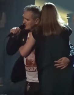 It always somewhat irks me to see people get on the stage and throw themselves recklessly at Morrissey, knocking or pulling him off balance, or half strangling him by hooking their arms around his neck, and in my anxiety not to be one of these people, I go to the other extreme and put my arms around him as gently as if he were made of eggshells. Perhaps he is so precious to me I’m afraid he will break! The scent of his perfume hits me more strongly than ever, and as I withdraw I say a ‘thank-you’ quietly in his ear. I’ve no idea if he can hear me, but I say it anyway, not wishing to shout.