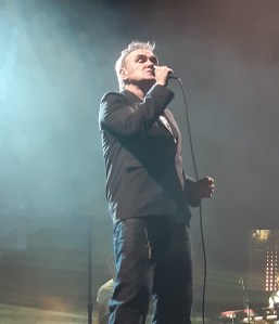 Since the crowd are not so tightly packed together as they were at this point in Leeds, I am able to sit down during the 2 ½ hour wait for the show to begin, leaning back against the barrier looking at my phone and many pairs of feet, and I have hopes that we will not experience the same degree of pushing and shoving that we did in Leeds. Not so. As soon as the show begins, the crowd turn into a rabid mob, and I must continually ensure that my arm is pressed up against that of the young man on my right in order to prevent us being ousted from our coveted barrier spots. This has the effect of inching us gradually to the right over time, and the young lady on my left is not so savvy and is later replaced by a fresh face. Whenever Morrissey comes near I have to block my ears to protect them from the piercing shrieks of young audience members at my shoulders.