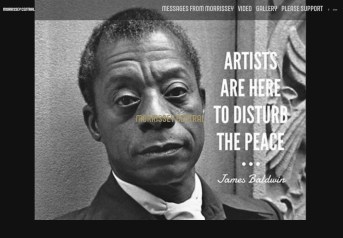 A: Writer and civil rights activist, James Baldwin. Morrissey has long been an admirer of Baldwin, and as well as featuring him on his website, has also shown clips of him during his pre-show videos, and images of him on the backdrop during the show. In Autobiography, Morrissey describes seeing Baldwin at a hotel in Barcelona in 1986, but being too much in awe of him to approach. He writes of Baldwin,