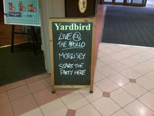 At last I am able to leave my office and make my way on foot to the train station, from where I am whisked to Kings Cross in just over two hours. After battling my way through the London rush hour I eventually emerge from Hammersmith Tube station where I am immediately greeted with a pub sign which, although misspelt, successfully entices me inside in search of food. The pub is busy and I stand awkwardly at the bar with my pint of beer and bowl of chips until two men invite me to join them at their table. They are not Morrissey fans, but locals, who I suspect are not on their first pint, but they are a comical and harmless pair, and at my age I feel no threat from their humorous advances. One of them seems to be partially deaf, but the other talks to me enthusiastically, occasionally repeating some of the conversation to his friend. “Aw, she’s travelled all the way from Leeds to see Morrissey”, he tells him. I assure him that there will be plenty of people who have travelled considerably further. Declining lively offers of more drinks and entreaties to stay longer, I make my final bathroom stop, and step outside again.