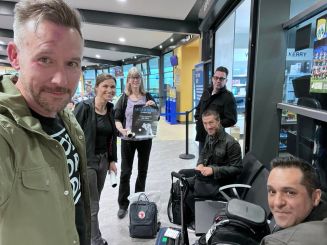 Making our way through security we spot some members of the Morrissey crew ahead of us, and suspect this to be the cause of the confusion. Once seated in the small departure lounge we begin to spot band members also, but we try to maintain some calm decorum. However, when Alain Whyte appears we can no longer contain ourselves, and feeling this is an opportunity not to be missed, we pull out our tour posters and approach him sheepishly. He is happy to chat with us and sign our posters, but we are unable to catch the eye of the other band members that are with him, and we eventually thank him and shuffle back to our seats like two naughty school girls.